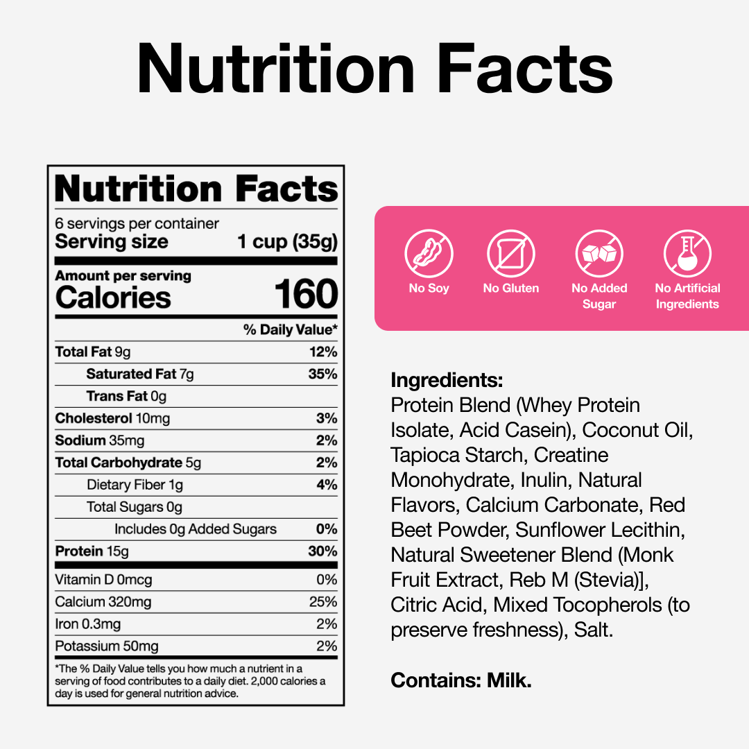 2.5g Creatine. 16g Protein. 5g Carbs. 0g Sugar.
