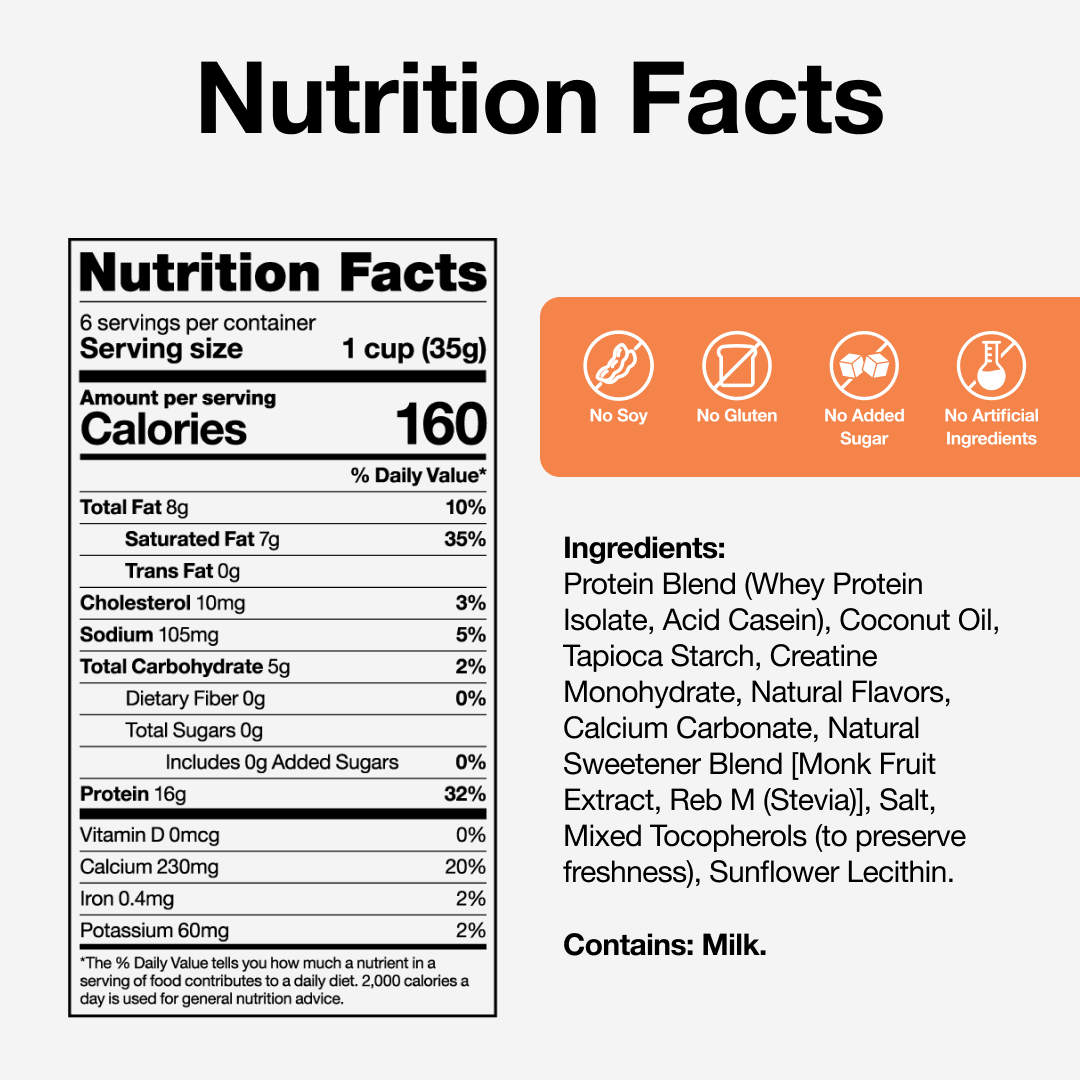 2.5g Creatine. 16g Protein. 5g Carbs. 0g Sugar.